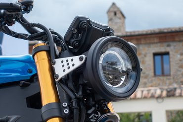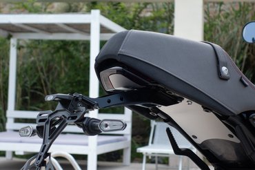 A hátsó lábtartók mellett nem tudok elmenni szó nélkül, igazából minden motoron ilyeneket szeretnék látni. Szememnek különösen kedves részletek az ülés alatti fémhálós-gyorszáras idomok illetve a sötétített hátsó lámpa, ami álló helyzetben szinte eggyé olvad a szintén régi GP-motorok farokidoma által inspirált hátsó üléssel. Persze még nagyobbat mutatna egy fényezett üléstakaróval, de állítólag hamarosan ez is elérhető lesz a kiegészítők között. A kormányvég-tükröket viszont nem kell utólag felcsavarozni, mert végre alapból azok vannak a motoron. Bár van egy-két csúnyácska vaskonzol, vagy szabadon hagyott kábel, a kidolgozás messze igényesebb a japán átlagnál.