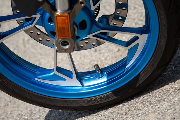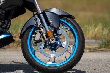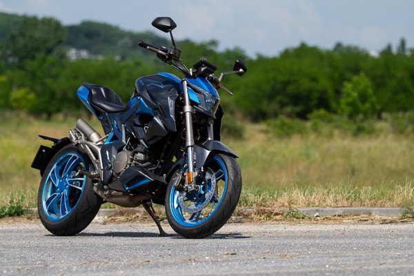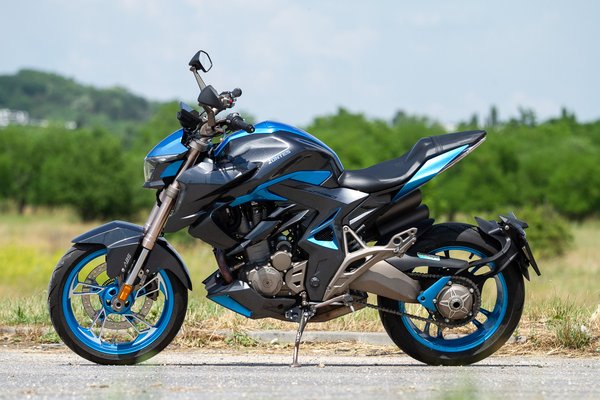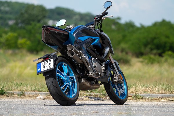 Ami a kiállását illeti, a megosztó itt a megfelelő terminus technicus: ha jóleső érzéssel tölt el, hogy a járókelők és közlekedőtársak azt firtatják, vajon mi lehet ez az űrhajó, amin ülsz, akkor tetszeni fog. Ha inkább szeretnél minél jobban beolvadni a környezetbe, mint mikor a földrajztanár a következő felelőt választja ki a Szovjetunió kőolajlelőhelyeinek tárgykörében, akkor ez nem a te motorod. A kétszínű kék-szürke fényezés egyértelműen vonzza a tekinteteket, ahogyan a metálkékre fényezett alufelnik és a LED-es fényszóró és zárófény is. A kuplung- és fékkar, valamint az első fékfolyadék tartályának egyedi színét nem is sikerült megfejtenem: valami olyan metálbarnás-metálsárgás színt kapott, aminek talán csak kínaiul van szabatos megnevezése.
