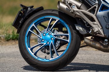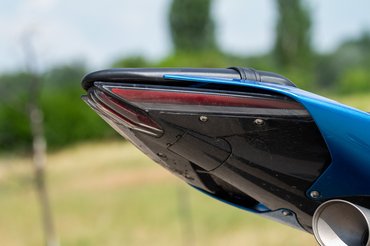 A dizájn fontos része még a jobb oldalra kihúzott, nem túl tolakodó hangú dupla kipufogóvég. Mivel a kettőből csak az egyik volt lekormolódva, először azt hittem, hogy a másik nem is pöfög, csak dísz, aztán járó motorral is szemügyre vettem őket: valóban, az egyik jó nagy lendülettel, a másik meg csak visszafogottan muzsikál. Ennek az az oka, hogy nem szimmetrikusan ágaznak ki a kipufogócsőből: az egyik annak egyenes folytatása, míg a másikat egy útelágazódás kényszeríti visszafogottabb jelenlétre.