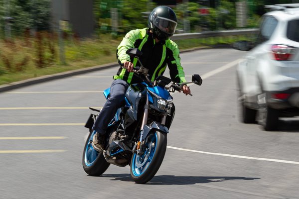 Vérszegénynek egyébként nem mondanám, a rövidre szabott első két fokozat is szerepet játszik abban, hogy városi forgalomban bőven elég a lendületes közlekedéshez, de még országúton is könnyedén fel tudja venni a forgalom ritmusát. Egyedül autópályán érezhetjük majd kevésnek: bár a katalógus szerinti 160-as végsebesség alapján nem erre számítanánk, de 110-120 fölött már nem túl élvezetes a naked bike vezetése: minimális a szélvédelem, megjönnek a kellemetlen vibrációk és hangeffektek, és az elölről nyitott oldalburkolatok is képesek lehetnek megimbolygatni a kasztnit. De ez utóbbi csak spekuláció a részemről, mert az otthoni szélcsatornám éppen ebédszünet miatt zárva van. Az mindenképpen jó hír, hogy az oldalszélre nem különösebben érzékeny a motor.