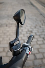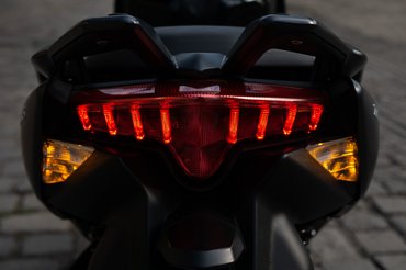 Még a visszapillantó szárában is van egy kis blikkfang, egy kanyar itt, egy kis ív ott – lehetne csak egy sima fém rúd, de csak azért sem. A hátsó kapaszkodó, a full ledes lámpák fénydizájnja, a markolatok, fékkarok, mind önmagukban is jól kinéző, minőségi tárgyak, együtt pedig összeállnak egy olyan robogóvá, amit okkal néznek meg az emberek. Az egész annyira átgondolt, hogy a látványban egy hibát tudok felhozni: a kipufogódob hővédő burkolata alól kanyarodáskor kilátszik az a rész, ami kicsit elszíneződik a gyártás során, amikor a belsejét odahegesztik. Ugye, hogy ez már szőrszálhasogatás?