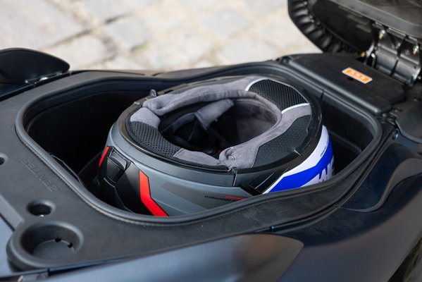 A 310M felépítése teljesen szokványos: nem sík a lábdeszka, derékban meglehetősen erős a gép, hogy ne csavarodjon. Ezen a részen van a 12 literes tank is. Ha a Zontesnek fel kellene sorolni a valódi hibáit, nálam egyetlen tételből állna a lista: az ülés alatti rekesz kicsi, és olyan alakú, hogy gyakorlatilag csak egy bukósisakot lehet belerakni, fejjel lefelé. Sajna itt a konkurencia sokkal erősebb, az Xmax 300 vagy egy Forza 350 rekeszébe két bukó fér be szellősen, de majd a végén mindenki eldönti maga, hogy van-e az a pénz, amiért a Zontes rekesze lehet akár kicsi is.
