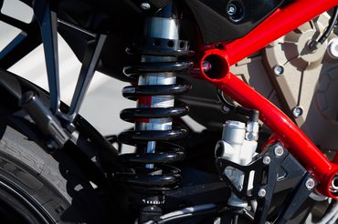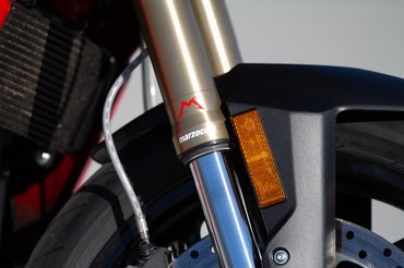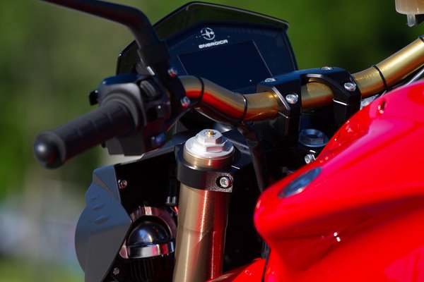 A beszállítókat jó érzékkel válogatták össze, a fékrendszer a Brembótól származik, a radiális főfékhengerhez M50-es monoblok nyerget és 330-as tárcsákat párosítottak - szükség is van rá a 260 kilóhoz. A 43-as, minden paraméterében állítható villa a Marzocchitól érkezett, a lengővillához himbarendszer nélkül, direktbe csatolt, oldalra szerelt rugóstag pedig a Bitubo terméke. És ami a legfontosabb: jól sikerült a hangolás. Ráülsz, és érzed, minden a helyén van: jó a térdszög, az üléspozíció, megfelelő helyen van a tömegközéppont, a futómű pedig rendesen dolgozik - rossz úton pocsék, de a hazai állapotokról nem az Energica mérnökei tehetnek, az viszont őket dicséri, hogy 10 méter után már érzem, hogy ezt pályán rommá lehet térdelni, mert tudja.