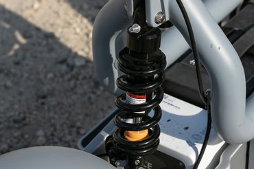 A kerékméret ugyanúgy 14-es, de a gumik vaskosabbak, jobban is fordul az Ösa mint a Makka, persze 45-ös végsebességgel ezt tényleg hamar ki lehet motorozni. A 45-ös végsebességhez bőven túlfékezett a kisebb gép is, itt már elöl négydugattyús tárcsafék van, fémszálas fékcsövekkel, még több erővel és ABS nélkül, de továbbra is finom, precíz adagolhatósággal. Ami furcsa, hogy az Ösa még levegővel is állítható rugóstag helyett egy sima, egyszerű, kizárólag rugó-előfeszítéssel keményíthető hátsó teleszkóppal érkezik, de itt sem volt gond a csillapítással, összességében kicsit keményebbre van hangolva az Ösa mint a Makka, és pont ennyivel viselkedik ügyesebben kanyarban.