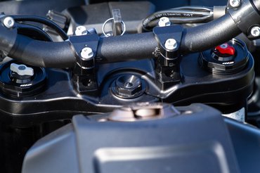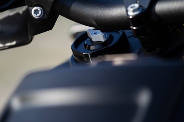 Bár a futómű első ránézésre felső polcos holminak tűnik, a hátsó gátlón csak a húzófokozat állítható. Mondjuk az is több a semminél, és elöl a húzó-/nyomófokozat kézzel tekerhető. Viszonylag puha az alapbeállítás, a kellően harapós J. Juan radiális nyergek rendesen beültetik az elejét. De a Pirelli Scorpion Rally STR abroncsok egyébként is jelzik, hogy nem hegyi felfutóra való a setup. Ettől függetlenül a túraendurók felépítésükből adódóan igen jól teljesítenek hegyen, a Norden pedig futóművét tekintve is jóval agilisabb az átlagnál. Ülve és állva is játékosan mozog, csak utóbbi pozícióban kicsit szélesnek érződik. Merthogy az ülése is szélesebb és kényelmesebb a szokásos terep-nyergeknél. De akinek ez komoly gondot okoz, vehet hozzá keskeny egybeülést. Illetve fókuszált terephasználat esetén valószínűleg jobban jár, ha a 890 Adventure R szintén 890 millis ülésmagasságával és jóval hosszabb rugóútjaival kezd el barátkozni. Bár a blokk mellé nyúló 19 literes tank állítólag igencsak strapabíró anyagból készül, bukócső hiányában én kerültem a rizikósabb bevetést. Átlagos terepes vagy földutas barangoláshoz természetesen bőven van tartaléka a futóműnek. Ami viszont hiányzik, az a kézzel állítható hátsó rugó-előfeszítés. Ennél olcsóbb motorokon is adott a lehetőség, hogy egy mozdulattal a terheléshez lehessen állítani.