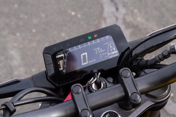 Tök jók a kezelőszervek, gyorsan a kezemre állt minden, kivéve a vészvillogót, mert az egyáltalán nincs is rajta. Szintén fura, hogy az egyébként tök jó LCD kijelzőn duplikálták az üreslámpát: van egyszer egy fokozatjelző, ami tud N-t írni, és van a sima zöld üreslámpa fölötte. Örülök, hogy a Rebel 500 után ezen a műszeren végre van fordulatszámmérő, ide tényleg nagyon kell, egyébként meg a legfontosabbakat tudja a kijelző, a pillanatnyi- és az átlagfogyasztást is kiírja.