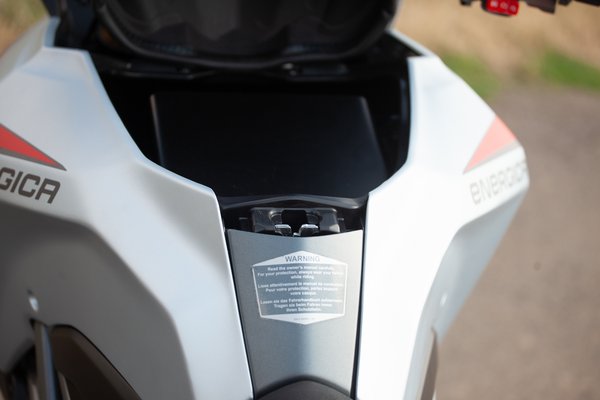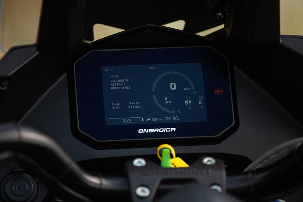 A radiális Brembo nyergekkel és szintén radiális munkahengerrel megtámogatott fékrendszer pedig sportmotorokra jellemző fékerővel és adagolhatósággal rendelkezik. A végsebessége száznyolcvanra van limitálva, de érzésre kényelmesen tartaná a kiló-ötvenet. Már ha nem kezdene drámai módon zuhanni a hatótáv a konstans nagy tempótól. Így az út nagyobb részét a megengedett tempó közelében, kifejezetten óvatos gázkezeléssel tettem meg. A kicsivel több mint 70 kilométer 30 százalékot emésztett fel a hatótávból, de a gyárilag megadott 256 kilométeres hatótávot biztosan meg sem közelíti, ha rendes túramotorként, csomaggal-utassal használnád.