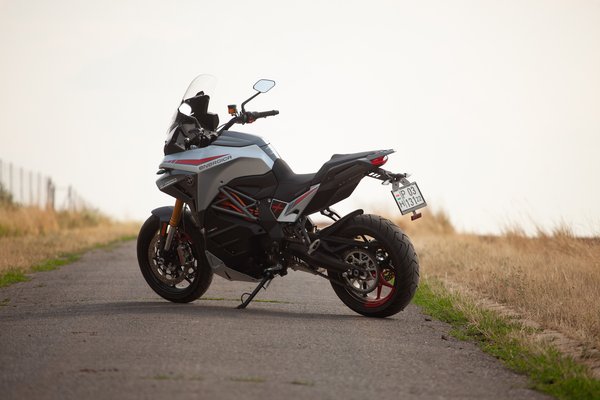 Egyébként méretét és üléspozícióját tekintve is a Yamaha Tracer 9-essel tudnék leginkább párhuzamot vonni, ha hagyományos motorokhoz szeretném hasonlítani. A dizájn nem különösebben egyedi, de sokkal egységesebbnek tűnik, mint a csupasz Eva Ribelle vagy Eva Essesse esetében. Nyilván több műanyaggal több mindent lehet eltakarni, és formailag is nagyobb a tér a játékra. Az alkatrészek minősége azonban szemre is rendben van, és nem csak a nagy nevű beszállítók termékei. A térhálós hibrid váz épp olyan igényes megoldás, mint a formás alu lengővilla vagy a sok küllős felnik. Opcióként mart alu OZ felniket kérhetünk hozzá, rongyos háromezerpárszáz euróért.