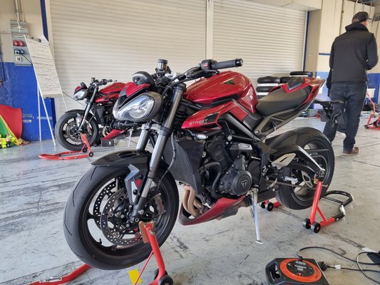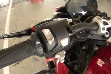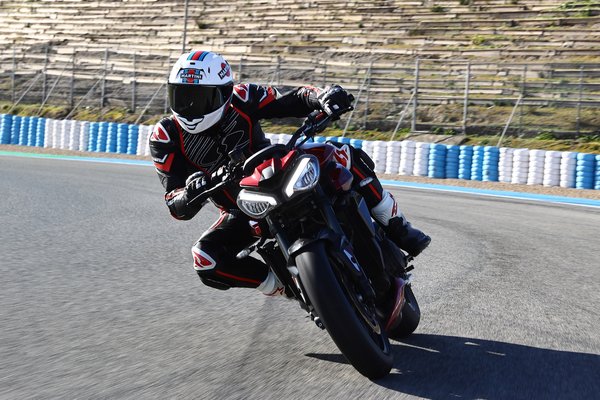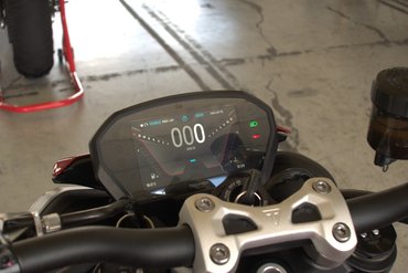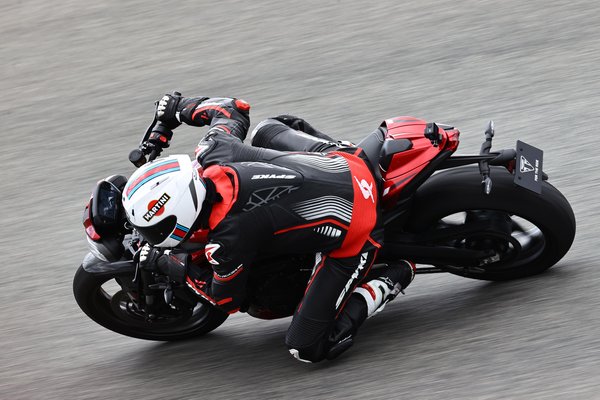 A gyorsváltó szintén kifogástalan. Aki egyszer rászokik, utána már soha nem akar nélküle motorozni. A két lassabb jobbos után jön a pálya talán legizgalmasabb része. Két hosszú balos visz bele egy beláthatatlan tempós jobbosba folyamatos szintkülönbség mellett. Ide a Streety barátságos karakterisztikájánál kívánni sem lehet jobbat, és a kiválóan működő kipörgésgátló további önbizalmat ad. Természetesen Track módba van állítva, ahol az ABS a hátsó keréken megszűnik létezni, és az egykerék kontroll is inaktívvá válik. Sajnos a beavatkozás mértékét a konkurensekkel ellentétben nem lehet állítani. A mérnökök szerint a felhasználók zöme többre értékeli a minél egyszerűbb menüt és funkciókat, mint a pontos skálázhatóságot. Azért természetesen van egy Rider mód is, ahol össze lehet variálni a beállításokat. (TC, gázreakció, ABS, stb.)