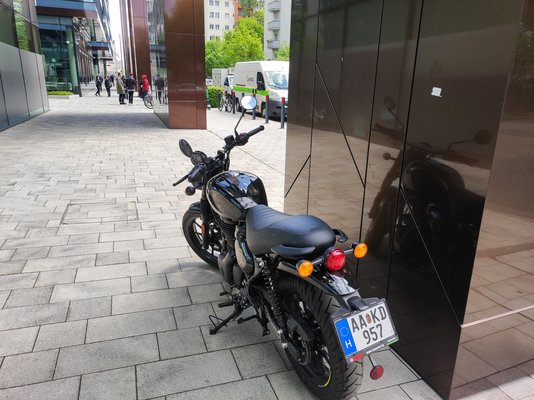 Volt a Hunternek egy egészen hasonló elődje, a Royal Enfield Classic 350, ehhez képest lehet például a jelentősen megrövidült tengelytávot nézni, ami jelen darabnál 1370 mm, és bámulatosan fordulékony is (bár elődjét természetesen nem próbáltam). Egészen eszményien lehet vele manőverezni szűk helyeken, csak úgy pattan át az autósorok között, tökéletes pontossággal, imádtam a városban összevissza járkálás és különféle ügyek intézése közepette ezt a könnyedséget, amivel befordul a kis utcákba, fel a járdára, le a járdáról, mindenféle nehézség nélkül.