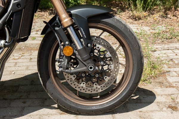 A futómű meg a fék pont ezt a teljesítményt szolgálja ki. A 41 milliméteres csúszószár-átmérőjű Showa SFF-BF villák lehet, hogy nem állíthatóak, de nem is hiszem, hogy valóban szükség lenne rá. Kakucson is marha élvezeteset fordultam vele, meg odakint sem pattogott el. Van jobb? Van. De bárcsak ilyen lenne a rossz. Ugyanez volt az élményem a radiálisan rögzített Nissin fékekkel is. Van jobb? Van. Bárcsak ne lehetne ennél rosszabbat kapni.