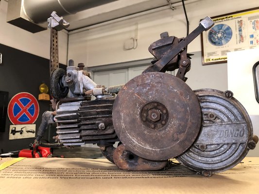 Mai szemmel nagyon szánalmas dolog egy Dongó, de anno elképesztően menő lehetett, az alap konstrukció (amit az olasz Garelli Mosquito „ihletett”) kompakt, ötletes, és sokaknak jelentette a motorizáció alapját. Apám sokat emlegette anno a Dongót, miszerint ők is dongóztak, meg hogy valahol meg van még. Aztán egy pakolászás során kiderült, tényleg ott pihen motor a padláson. Ötven-hatvan éves por és pókháló lepte, eszembe se jutott, hogy restauráljam – minek nekem egy kerékpárra való segédmotor? Aztán, mikor bekerült a műhelybe a csodás Vixen Aquablast gép, a vizes szemcseszóró, eszembe jutott: fali dísznek hibátlan lenne a Dongó. A gépben látványosan meg lehet szépíteni az öreg öntvényeket, ráadásul, mivel csak dísz lesz, szét se kell szedni, pikkpakk megvagyok vele.