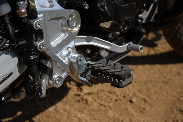És a lényeg: a futómű. Tudja, tudja és tudja! Motoros cuccban 120 kiló vagyok legalább és nem kellett semmit állítanom rajta sem közúton, sem a bányában. Nem történt fájdalmas felütés, és még utassal is gázelvétel nélkül mentünk át kisebb járdaszigeteken is. Az elején szinte nem is hittem el, aztán lassan kezdtem bízni benne és megszokni, hogy ez bizony az, aminek látszik. Egy archaizáló kinézetű, de valójában is terepképes motor. Oké, nem extra könnyű, nem extra keskeny, kicsit azért lehetne kevesebb súly az elején, meg a 19-es kerék is pusztán a legélhetőbb kompromisszum egy dualsport gépnél. A tömeg kijött akkor is, amikor sikerült túl finoman elindulni nagy kormányállásnál földúton, amit többször is beszívtam, mert bár megtévesztően virgonc a jószág, azért mégiscsak egy kis 450-es, így forgatni kell.