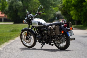 A legjobban talán a műszerfal rántott ki az időutazásból, mert az analóg órák mellett modern hatású (ez kontextusban értendő) digitális számjegyek meséltek a megtett kilométerek számáról. Van fokozatjelző, meg rubrikáról rubrikára fogyó benzinszintjelző. A blokk injektorosan lustán pörög fel, az ABS meg kattog, mint egy narkós a Szigeten, amikor úgy rendesen megtapostam a hátsó féket.Már amikor működött: a visszaadás előtti tankolás után – tudniillik bevett szokás szerint a tesztmotorokat tele tankkal hozzuk el, és a saját kis forintkáinkból visszatöltve, ugyanúgy fullon adjuk vissza, mert hát nem vagyunk mi Ausztria – a blokkolásgátló egészen egyszerűen beszart. Nem csak a visszajelző lámpa viccelődött, hanem kajak megkotlott és húztam egy csíkot az importőr előtti fehér aszfalton. Majd a következő indításnál megint minden rendben volt. Hajlok rá, hogy ez egyedi jelenség volt, nem rendszerszintű hiba, mert nem találtam nyomát, hogy ez a tulajdonosok széles körében ismert jelenség lenne, de azért nem öntötte el a mellkasom a megbízhatóság jóleső melege.