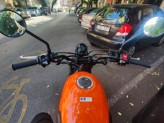Később a városban is az Üllői út és a Kerepesi rég megszokott, rémesen idegesítő, dobáló hullámai és kátyúi: majdhogynem kellemes, hullámzó hajózás. Járdákra fel és le szinte észrevehetetlenül siklik, és eszméletlen biztonsággal lehet vele beállni a pontosan előre megtervezett öt centis sávra. Ezt a motort a förtelmes állapotú közutakra tervezték, egyenesen azért, hogy megédesítse a mindennapos istenverte küzdelmet a városi utak maradék romjaival, ez szent meggyőződésem. Ki a fenét érdekel akkor már, hogy nem néznek meg vele úgy, mint egy sportmotorral. Egyértelműen ez, a felfüggesztés és a könnyű kormányzás a motor legjobb oldala.