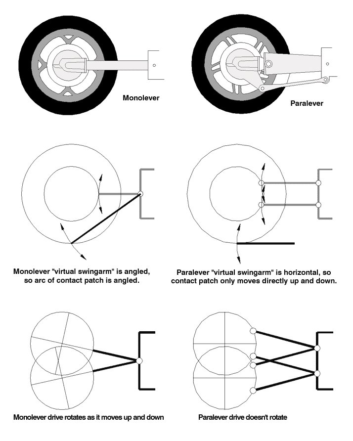 Zsenialitása abban rejlik, hogy teljesen szétválik a kormányzás és a rugózás. Ezáltal biztonságosabb, stabilabb és kellemesebb vezetési élményt nyújt: a motorkerékpár tömege a sárvédőnél található gömbfejen támaszkodik a motorblokkból kiinduló lengőkarra, amelyen keresztül egy központi rugóstag végzi a rugózást és lengéscsillapítást menet közben.