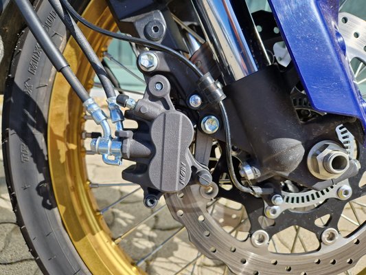 A teherviselő elemként funkcionáló motorblokkok túraendurós használatánál mindig sarkalatos pont a haspáncél, mivel azokat alapesetben csak a blokkhoz lehet rögzíteni, aminek az eredménye, hogy mindig inkább esztétikai kiegészítőkké válnak, valós védelmet viszont nem kínálnak. A nyolckilós Stromnál azonban masszív, mert egy kiegészítő segédvázra erősítették. A futómű elől-hátul állítható, bár én nem nagyon nyúltam hozzá, nyaggattam ahogy van és elég sokat elmond, hogy terepen, városban, túrán, utassal és versenypályán is kellemes volt, ha megszokta az ember és számolt a kellemesen puha elejének fékezéskori összeülésével.