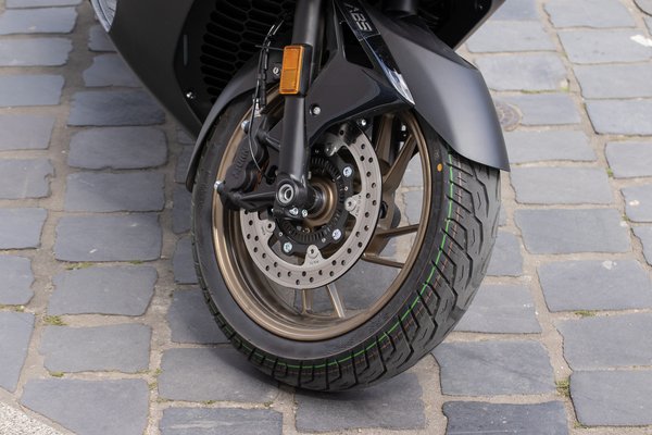 A kínaiak könnyen túltolják a formákat, láttunk már erre számos példát, de a Zontes megtalálta az arany középutat. Átmatricázva simán elsüthetnék nekem az E350-et, mint Honda, Yamaha, esetleg Kymco. Elhinném, hiszen sehol sem lóg ki a lóláb. Messziről világít a 268 milliméteres első féktárcsa ahogy 4 dugattyús, hidraulikus féknyereg markolássza, és hátul is csak 3 milliméterrel húzták összébb az átmérőt, ott inkább az egy dugattyús nyereg tűnik kicsinek. Nem is olyan határozott a fékerő, erősen kell harapni a karokon, hogy rövid úton megálljon a 200 kilós E350, de legalább kétcsatornás Bosch ABS asszisztál az éles helyzetekben.