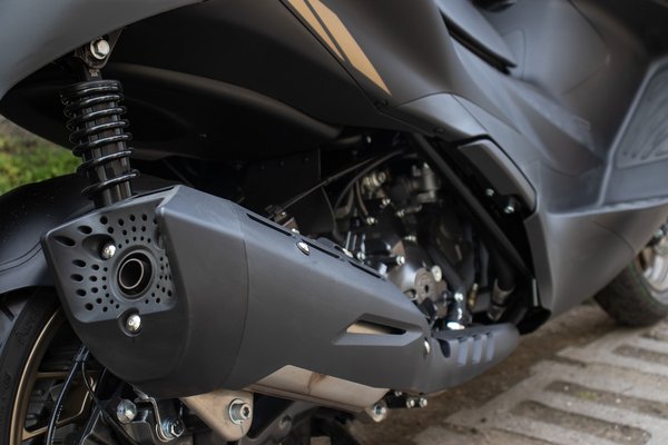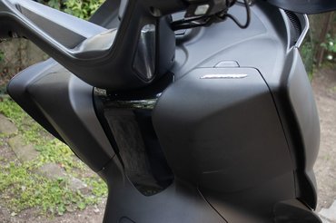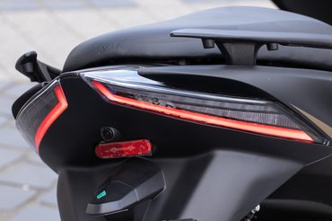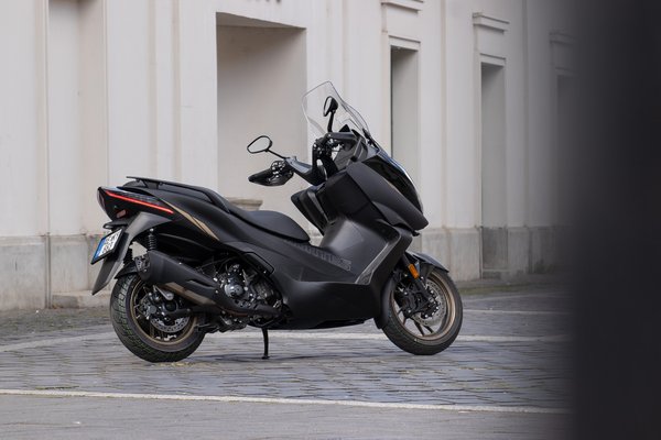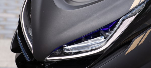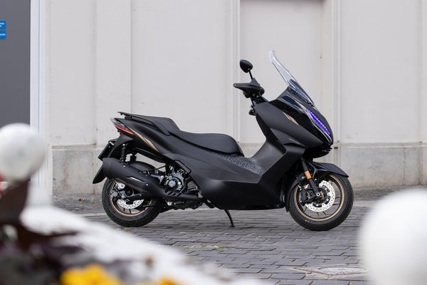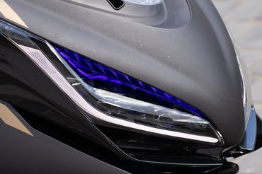 A ma kapható divatos és modern nagyrobogók közé abszolút illik az E350 dizájnja. Nagy bogárfejet kapott előre látványos nappali menetfényekkel és LED-es tompított, illetve távolsági fényszórókkal. Kis érdekesség, hogy a két lámpatest belső felén, a burkolatok alól fényes lila világítás szivárog, ezzel még vagányabb az E350 megjelenése. A seggét sportosan felhúzták, erre pedig a burkolatok fényezésével is alaposan rájátszanak. Hátul, mintha kitinpáncél alól bújnának ki finom hártyás szárnyak, úgy jelenik meg a két lámpatest úszófényes index-szel és még több LED csíkkal.
