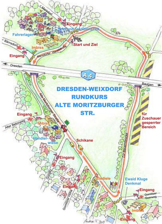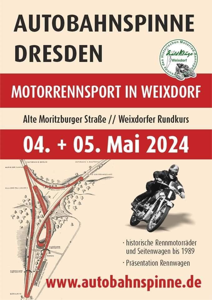 Kihozták a fészerekből és garázsokból azt, amit a háborúból megmentettek, s elkezdték keresni azokat az utakat, amelyeken versenyezhetnek.” Ez nem volt egyszerű feladat, mert gyakorlatilag nem maradt épkézláb és használható útfelület, de megoldották. Mindenhol versenyezni szerettek volna – a kerékpár- és a lóversenypályák is motorversenyeknek adtak otthont. „Drezda térségében állítólag a Cossebauder – Cossebaude Drezda legszélső északnyugati részén, az Elba bal partján található, a szerk.– versenyzője, Helmut Zimmer volt az, aki azt találta ki, hogy a drezdai északi autópálya háromszög területét versenypályaként használják fel. A zöld sávon néhány fix kereszteződés kialakításával (akkor még nem voltak védőkorlátok) egy versenypálya jött létre, amely végül az útvonala miatt az „autópályapók” nevet kapta. Akkoriban a viszonylag jó állapotú autópálya betonfelületet versenycélokra szinte ideális útfelületnek tartották. 6,443 km-es (később 5,3 km-es) útvonalhosszával megfelelt az akkori körpályákon szokásos távolságoknak is. A nézőszám az első években 120-150 ezer között mozgott, de ez később csökkent, és 20-30 ezer néző körüli szintre állt be. Két kivétellel (1956 és 1968) 1951 és 1971 között nemzetközi motor- és autóversenyek megrendezésére használták a rögtönzött pályát. Az 1968-as verseny egyébként a katonai stratégia áldozatává vált: le kellett mondani, hogy a Varsói Szerződés államainak esetleges Csehszlovákia felé tartó menete előtt (1968-as prágai tavasz) szabad maradhasson az autópálya. A pályát nem tartották különösebb kihívásnak vezetés szempontjából, de a megfelelő áttételek kiválasztása a hajtűkanyarok és a hosszú egyenesek miatt nem volt éppen egyszerű.” 1971-ig rendeztek itt futamokat, majd 2021-ben a történelmi motorversenyzés barátai – mivel közeledett a rendezvény hetvenéves évfordulója – azt találták ki, hogy felélesztik ezt a versenyt.
