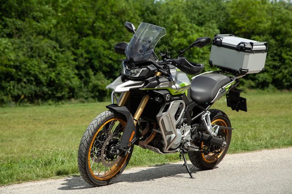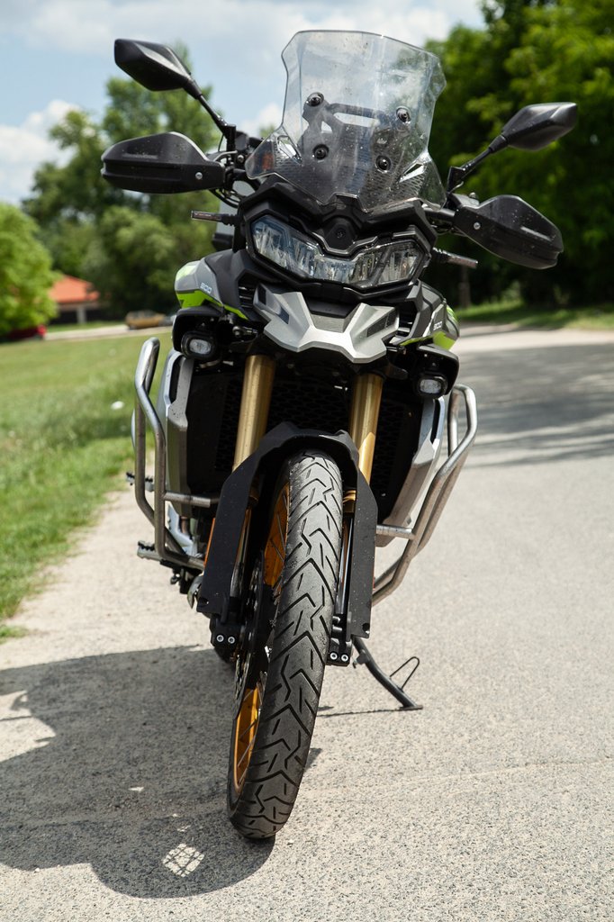Ezeket előre tudtam, ezért alapvetően egy kérdésem volt a teszt előtt: hol a kaki? Hol fog kibukni a kínaisága? Mibe tudnak majd belekötni a japánfanok? Először is, jól néz ki. Tényleg. Külsőre a kutya nem mondaná meg, hogy nem valami európai gyártó motorja. A fejidom és minden olyan, ami egy kalandmotoron meghatározza a sziluettet, korszerűen fest. Nincsen idejétmúlt, gagyi, megúszós része az optikának, sőt! Ami elsőre fel szokott tűnni az olcsóbb kalandgépeken, hogy mindig, már ránézésre is rövid a tengelytáv. Itt erről szó nincs, már ránézésre is kellemesen stabilnak fest. Aztán közelebb merészkedve sem csorbul a lelkesedésem. Még az én méreteimmel sem kicsi, ugyanakkor nem egy megmászhatatlan elefánt, feleslegesen terebélyes idomokkal. Pont jó.
