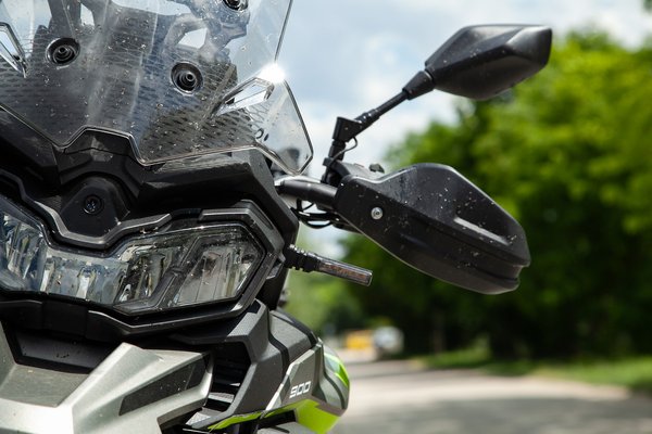 A plexit nemes egyszerűséggel kézzel lehet állítani. Nem túl nagy, de átlagos mérethez szerintem már megteszi a szélvédelem. Ha lesz nagyobb méretű hozzá, az már rendes túragőzöst farag a motorból. A tükröknél egyből szemet szúrt egy kis kábel, ami a kormány felől lép be a szárba: ez a radaros holttérfigyelő bekötése, ami kedves kis narancssárga háromszöggel figyelmeztet a sunyi helyen ólálkodó kocsikra, nehogy rosszkor váltsunk sávot.
