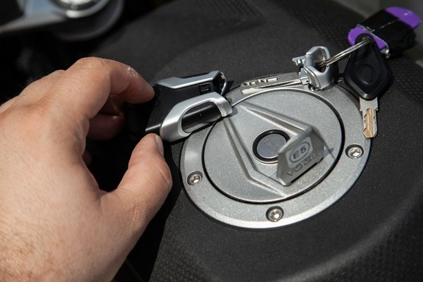 Aztán nyeregbe pattanva konstatáltam, hogy tényleg hosszú: kissé nyújtózkodnom kellet, hogy elérjem a kezelőszerveket. Természetesen kulcsnélküli az indítás, de hogy legyen egy kis csavar a dologban, a benzintank betöltőnyílása kulcsos. De nem ám bicskásan nyílik, hanem egy pöcök körömmel való elhúzása után kicsúszik a rendes kulcs a távirányítós egységből, és azzal kell kinyitni a tankot. Így egyszerre lesz a kezünkben tankolás-pakolászás közben két elhagyható dolog is. Ez nem túl átgondolt megoldás: vagy valamilyen kinyíló, kicsúszó, de egyben maradó rafinéria kéne, vagy legyen már a tank is kulcsnélküli.