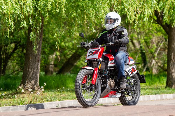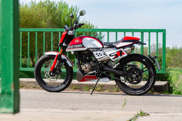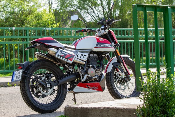 Szomorú ez, pláne az első benyomások után, merthogy dizájn, az van. Ahogy a neve is mutatja - FB Mondial Flat Track - vagyis egy magasított, enduroszerű dolog. És tényleg magas az ülés, 84,6 centi, amit én a 170 centimmel nem szeretek, de ez itt egyáltalán nem zavart. Ugyanis a 133 kiló annyira kevés, hogy nyugodtan meg lehet tartani a motort átlag izomzattal is.