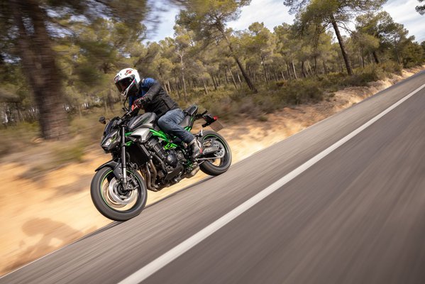 Továbbra sem egy balerina, 213 kilós telitankolt tömege manapság az ezres supernaked-ek között is soknak számítana. A kátyumentes, szűk spanyol szerpentineken nagyobb élmény lenne a huszonkilóval könnyebb konkurenseket dobálni egyik oldalról a másikra. Az agyonfoltozott, keresztbordás rögmagyar valóságban azonban minden bizonnyal stabilabban viselkedik majd a Kawa. Illetve kemény kigyorsítás esetén sem kezd idejekorán elkönnyülni a kormány. A forszírozottabb tempót a sportos gumiválasztás is támogatja - a Dunlop újfejlesztésű Q5A abroncsai feszülnek a felniken a szokásos 120/180-as méretben. Bár az álmoskönyv szerint ezeket érdemes az aszfalton tartani, a huligánkodás sem áll messzire a Z karakterétől. Ha véletlenül megcsúszna a kezed a kuplungon, kis segítséggel könnyen az égbe emelkedik az első kerék. Ezt a mélyen elítélendő közúti viselkedést a szabadon konfigurálható és menet közben is aktiválható Rider mód teszi lehetővé.