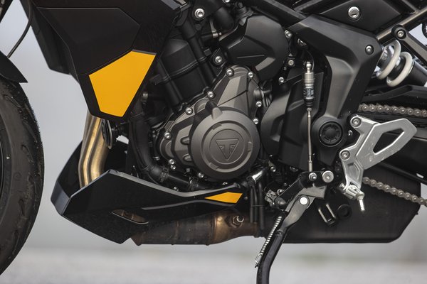 Mondjuk ez legyen a legnagyobb probléma, mert műszakilag pont azt tudja a nyolcszázas, ami a hathatvanasból hiányzott - leginkább a póver. Bár szemre a váz is azonos, a szinte teljesen új blokk szélesebb hengerfeje miatt át kellett tervezni a váznyakat. Bár 115 lóereje csak öttel kevesebb a Street Triple 765 R-nél, nem sok közös alkatrészük van. Az új blokk eleve egy jóval egyszerűbb acél csővázban foglal helyet, és kisebb fordulatra van hangolva. Mellesleg megjegyezném, hogy már feltűntek a neten kémfotók a nyolcszázas Trident-ről, szóval szerintem a Street Triple R napjai meg vannak számlálva. A forgattyúsház megegyezik a 660-assal, viszont a 4,6 milliméterrel hosszabb löket miatt új főtengely és hajtókarok kerültek beépítésre. Bár szeret forogni, ez egy inkább nyomatékra hangolt blokk. Igy az első három fokozat váltóáttétele is hosszabb, a negyedik megegyezik, az ötödik rövidebb, a hatodik ugyancsak hosszabb áttételt kapott. Valamint a végáttétel is hosszabb, ezért a nyolcszázasnak egyeltalán nem esik nehezére a magasabb utazó tempó, százharmincnál kicsivel ötezer felett forog a főtengely.
