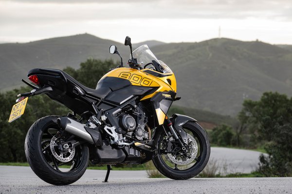 A nem kifejezetten jellegzetes dizájnt a nyolcszázas esetében leginkább a fényszórók fölött elhelyezett menetfény és a Street Triple-től örökölt pompás kozmikus sárga gyöngyház-metál fényezés teszi látványossá. Az alapszín a szürke-metál, a sárga/kék/fekete feláras. Továbbá kis kiegészítő szélvédő elemek és széria hasidom különbözeti meg a kettőt. Semmi sincs túlméretezve, a plexi legfeljebb mellkasig ér, és a fara sem sokkal teltebb a Tridentnél. Az ígéretek szerint jóval kényelmesebb új ülés alatt pedig alig vehetőek észre a konzol nélküli oldaldobozok függesztési pontjai. Sajnos a nyeregből is nehéz megkülönböztetni a kistestvértől, mert ugyanaz a kvarcjátékra emlékeztető izé jeleníti meg az adatokat. Igazán megérdemelt volna egy rendes TFT kijelzőt ehelyett a katyvasz helyett, és kormánykapcsoló sem a kilencszázas Tigeren megismert háttérvilágításos prémium cucc. A széria tempomatnak például csak egyetlen gombja van. Tehát vagy bekapcsolod, vagy ki – de nem tudod gombbal változtatni a beállított sebességet és nincs stand-by üzemmód sem.