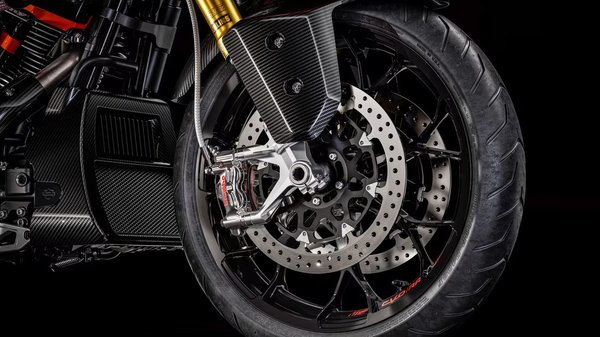 A nagy teljesítményhez méltó futómű dukál, mert hát anélkül ugye fabatkát sem érne az egész. Itt jönnek képbe a feje tetejére állított Öhlins FGR 253 villák, az alap CVO modellénél 13 milliméterrel hosszabb (130 mm) rugóúttal, nyilván előfeszítés, nyomó- és húzófokozati csillapítás állításának lehetőségével. Az egyébként sem kispályás Brembo M4 nyergeket pedig GP4-RX versenyalkatrészekre cserélték.