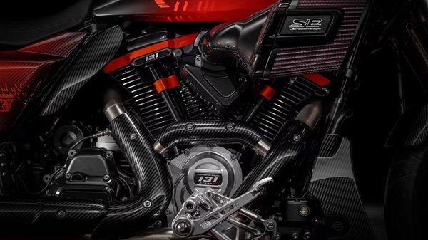 De a Harley nem csak felfúrta a CVO Road Glide motorját, hanem bele is nyúltak. Az úgynevezett "ported" folyadékhűtött hengerfejek meredekebb és mart szívó csatornával rendelkeznek, az égésteret pedig mart alumíniumból alakították ki. Ez a két módosítás lehetővé teszi a 2 milliméterrel megnövelt szívó- és kipufogó szelepek befogadását, amelyek a 68 milliméter átmérőjű fojtószeleppel kombinálva nagy gázsebességet tesznek lehetővé, ami végül nagyobb fordulatszámhoz vezet és ezáltal nagyobb teljesítményt eredményez. A racsing vezérműtengely 1,4 millimétert nyit a szelepeken, az égéstermék pedig végül egy full titan Akrapovic kipufogórendszeren keresztül távozik. Valószínűleg elég állatul szól! A végeredmény pedig 153 lóerő 5.750-es fordulaton, valamint 204 Nm (!!!) 4.750-nél a 6.500-nál tiltó blokkon.