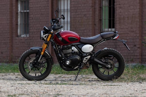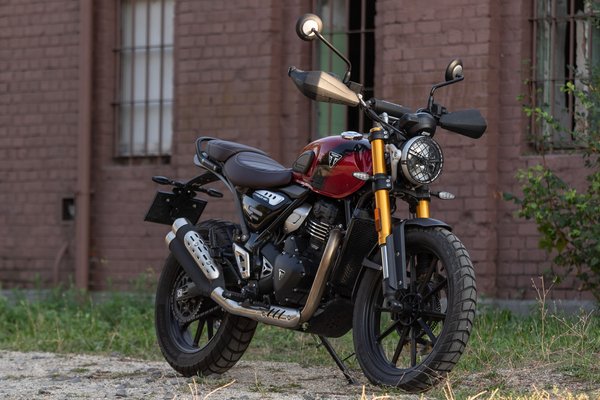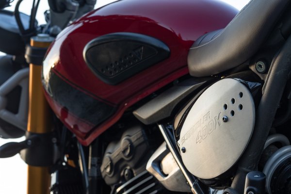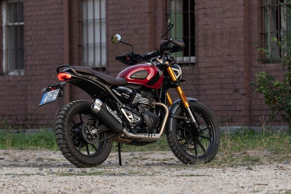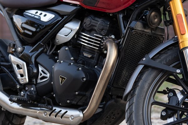 Hurkás üléssel, gumipárnás tankkal, felhúzott kipufogóval és mézsárgára eloxált első villával szépen eltalálták a scrambler stílus legfontosabb jegyeit és rendesen eltávolodtak a Speed 400 semmilyenségétől. A motorhoz közeledve nem hiányzik belőle az az 500-800 köbcenti, amennyivel a nagyok többet kínálnak, bár azoknak megint más a stílusa és jól néznek ki – a Triumph érzi a scrambler műfajt.