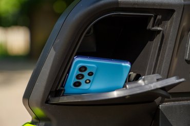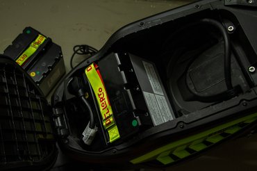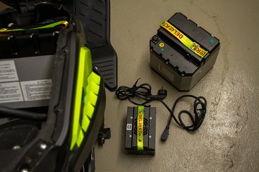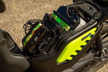 Pozitívum, hogy a töltőnek külön helye van a robogóban (nem úgy, mint a Honda EM1e-nek, aminek egy hatalmas, csak külön hordozható töltődoboza van) és 3 óra alatt feltölt egy aksit, relatív csöndben. Viszont egyszerre csak egyet tud tölteni, vagyis ha kettő van, akkor ez már hat óra és ne felejtsük el cserélni - legalább a kiszedésük egyszerű, csak egy-egy kábelt és a biztonsági reteszt kell levenni.