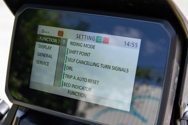 Azt nem mondom, hogy nem lehet vele előzni, de egy bizonyos fordulatszám felett rendesen megtorpan a kilométeróra ha a DCT nem vált fel és ez előfordul vele. Alaposan meghúzott gáz után a rendszer azt hiszi, hogy konstans tolnánk neki, ilyenkor hagyja forogni a főtengelyt, miközben mi már csak nyugisan hajókáznánk a megelőzött autó előtt. Ilyenkor érdemes besegíteni neki a váltógombokkal, de nekem például a visszaváltás frusztrálóan közel van az indexhez és a tempomathoz – nem mindig oda nyúltam, ahova kellett volna. A kormány vezérlői kicsik az én lapát kezemhez, főleg motoros kesztyűben. Pedig a kezelőszervek külön külön komfortosak, az 5 colos TFT kijelző vezérlője kifejezetten ügyes. Ezért külön hálás vagyok, mert a menükben rendesen el lehet veszni, de érdemes rászánni egyszer egy délutánt és megtanulni, hogy mi mit csinál. Rengeteg a motor működését és a motorozás élményét hangoló beállítás került ide.