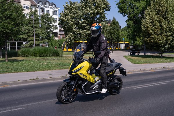 Nagy különbség azonban, hogy az X-ADV alatt komoly futómű és masszív váz van, így nem kezd el lengedezni rossz úton. Sőt, egészen tempós kanyarokban is stabilan viselkedik, pedig a futóművet inkább puhára hangolták, mintha kizárólag a budapesti hálózaton közlekedne a célközönség. A rugóút elöl és hátul is nagyjából 15 centi, míg a szabad hasmagasság közel 17, így sem fekvőrendőr, sem durvább kátyú nem hozza zavarba az X-ADV-t. Elöl 41 milliméteres, patronos villát építettek be fejjel lefelé (USD), így kisebb a rugózatlan tömeg. Hátul egy központi rugóstag van, ami a Honda Pro-Link rendszerén keresztül felel a rugózásért és a csillapításért a megerősített hátsó villán.