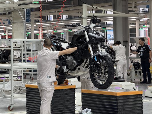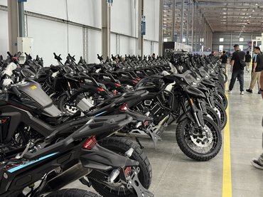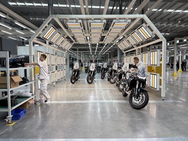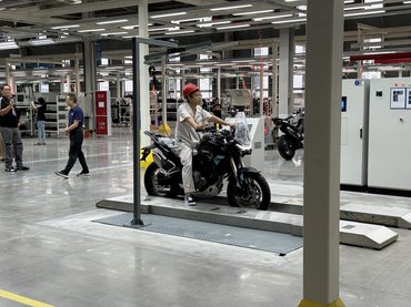 A bemutatóterem látványos, a Mrobidelli, a Benelli és a Keeway fontosabb motorjait is kipakolták forgó-mozgó, akár több emeletes állványokra vagy éppen a plafonról lelógatva. Motorból volt a kerítés, és akkor a gyárat még nem láttuk, csak egy szeletet kaptunk abból a meghökkentő elköteleződésből, ami az utóbbi időben a nagy kínai márkákra annyira jellemző. A szomszéd csarnok a próbagyártásra előkészített üzem volt, ahol egyelőre fontosabb volt a show, mint a tényleges gyártás. Lényegében egy látványkonyhát hoztak össze nekünk, amin a beöltözött munkások és felprogramozott önvezető robotok császkáltak eljátszva azt, hogy hogyan készülnek a motorok. Néhányat a sor végén be is indítottak, vagányan átverettek velük egy parkolóba, ahol felfoghatatlan mennyiségű motor állt egy helyen – talán mégsem volt kamu a gyártósor?