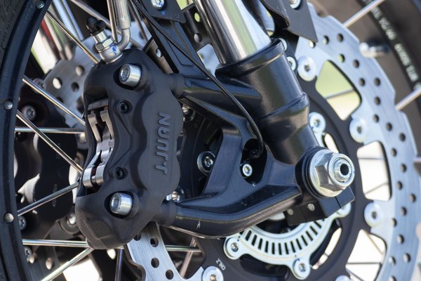 Tekerészhettem a futóművet ahogy akartam, nem jöttem rá a libegés nyitjára, pedig még azt is elnéztem volna a T1002VX-nek, hogy a szűk szerpentines kanyarba úgy kell beleerőszakolni, majd a végén izomból felhúzni. Jó edzés a szerpentinezés, főleg ha ketten ültök a motoron és még inkább libeg a kormány. Vért izzadt a csillapítás és nekem is kezdett zsibbadni a kezem egy hosszabb út után és az ujjaimat sem kímélte a rendszer. A fék ígéretesnek tűnik: elöl két 320-as tárcsát szorítanak a négydugattyús J.Juan nyergek és mindenhol Bosch ABS rendszer dolgozik, de mégsem az igazi. Talán itt is csak a motor súlya miatt érezni gyengének a rendszert, nincs egyujjas finomkodás, harapni kell a kart, ha érdemi fékerőre vágysz. A másik opció, hogy taposod jobb lent a pedált, a hátsó fék fog, de a 170/60-as gumi hamar blokkol, még akkor is ha az ABS egyébként ügyesen nyúl alá.