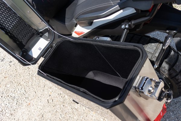 Ráadásul a T1002VX megüléséhez rendes méretű, erős ember kell, amiből kettő egymás mögött már papíron no-go zóna. Ráadásul ott vannak azok a szép, fémhatású zárható dobozok alapfelszereltségként. Vagy pont azok rángatják a motor hátulját nagy sebességnél? Kár lenne, mert bőséges pakolóteret kínálnak, jól néznek ki és masszív benyomást keltenek. Olyan dobozoknak tűnnek, amiknek borulás után sem kell a szilánkjait szedegetni és letépni sem fogják, ha éjszaka a főváros egy kétes utcájában parkolsz.