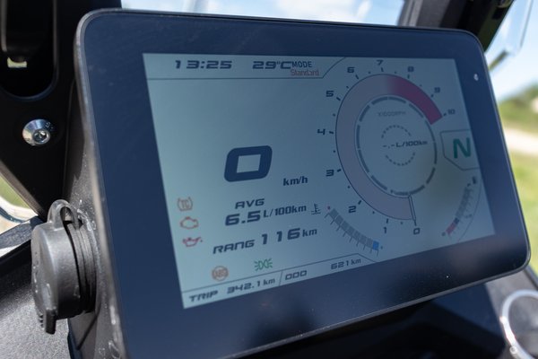 Az első és a hátsó csillapítás is állítható, ezzel játszottam valamennyit, hogy megszűnjön a lebegés, de még mindig ne vágjanak alám a nagyobb kátyúk. Ráadásul akkor még olyan vad terveim is voltak, hogy megnézem a T1002VX terepképességeit is, hiszen csak részben túra, a másik fele enduró. De pont hazafelé éreztem azt, hogy ezt nem érdemes feszegetni, mert az épített úton sincs minden rendben. Hetven-kilencven között már elkezdtem élvezni, stabilan fogtam a motort, amit kicsit noszogatni kell kanyarokban, de beveszi. Azonban egy kicsit gyorsítottam és elmúlt az önbizalom, a motor elbizonytalanodott és a digitális műszercsoport kijelzője is aggódva világított az arcomba.